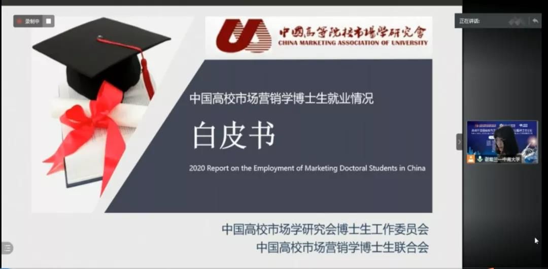 随后,会议发布了《2020中国高校市场营销学博士生就业情况白皮书》。中南大学商学院助理教授谢菊兰教授对《白皮书》进行简要说明。对博联会撰写《白皮书》的意义、《白皮书》的发展历史,以及新增加的疫情影响篇、访谈专题篇等内容进行介绍,并对指导老师和参与撰写的博士生表示感谢。